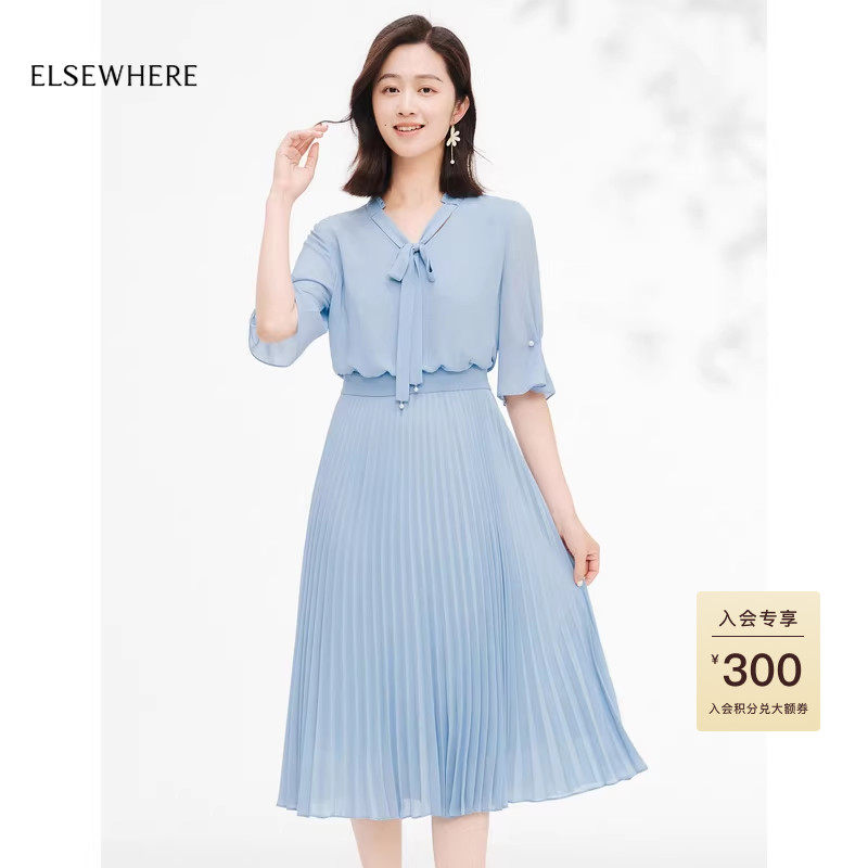 ELSEWHERE珂思法式雪纺飘带领百褶气质连衣裙女装夏季新款