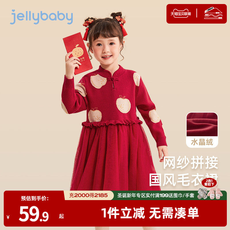女童新年红色针织长袖连衣裙冬装2025新款拜年服网纱拼接毛衣裙子