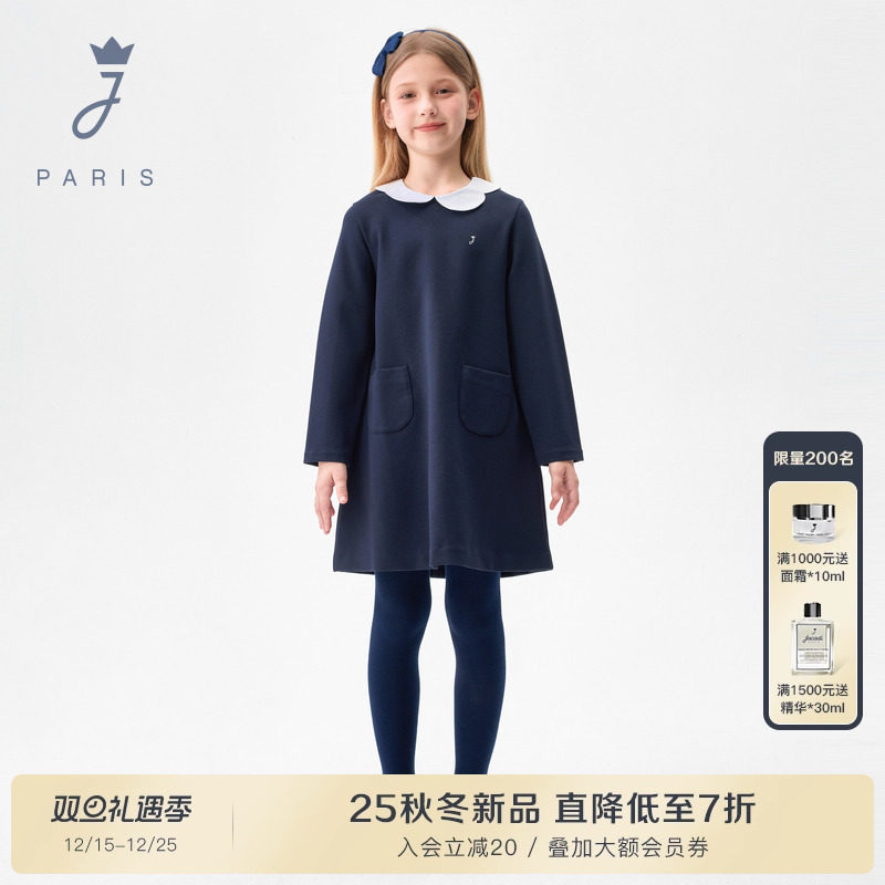 Jacadi亚卡迪女童长袖连衣裙2025秋冬新款娃娃领厚款裙子2085107