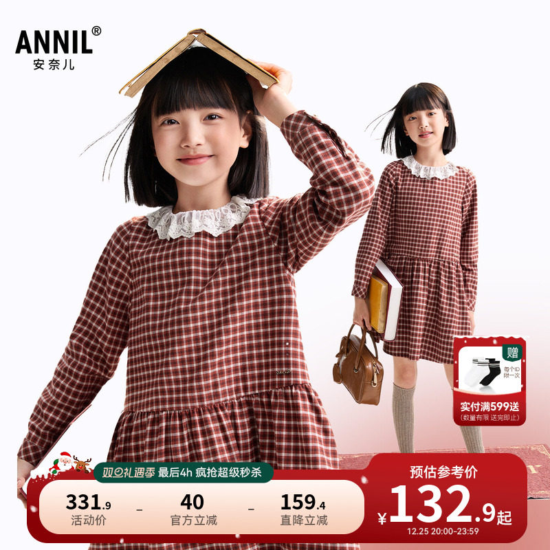 安奈儿童装女童长袖连衣裙2025秋新款时尚轻薄甜美学院风格子裙