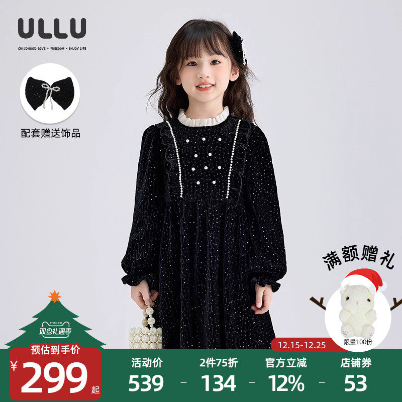 ULLU优露童装女童长袖连衣裙24冬款钉珠翻领丝绒拼网纱公主蛋糕裙
