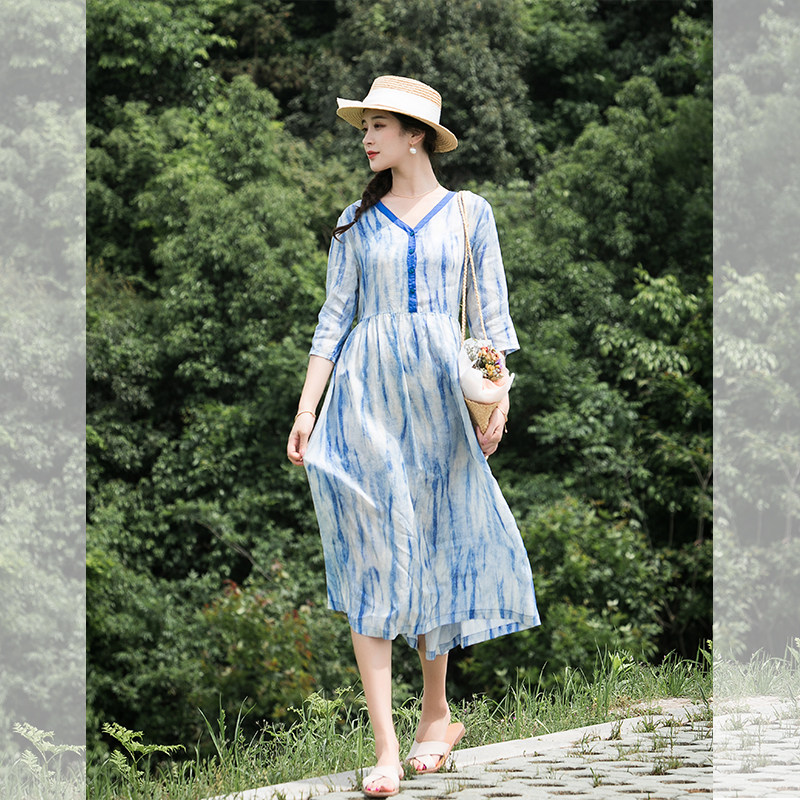 冉裳原创高腰甜美雾霾蓝连衣裙条纹修身闺蜜装到脚踝文艺苎麻长裙