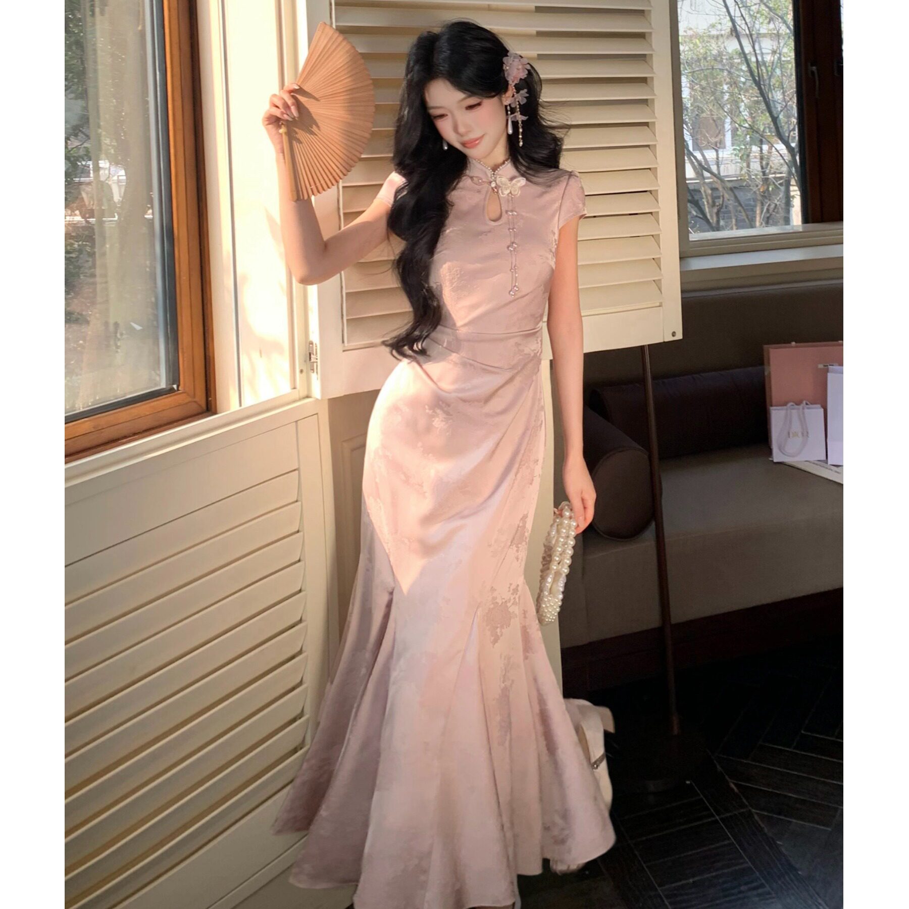 步步生莲温柔新中式女立领提花收腰轻国风旗袍显瘦鱼尾连衣裙女装