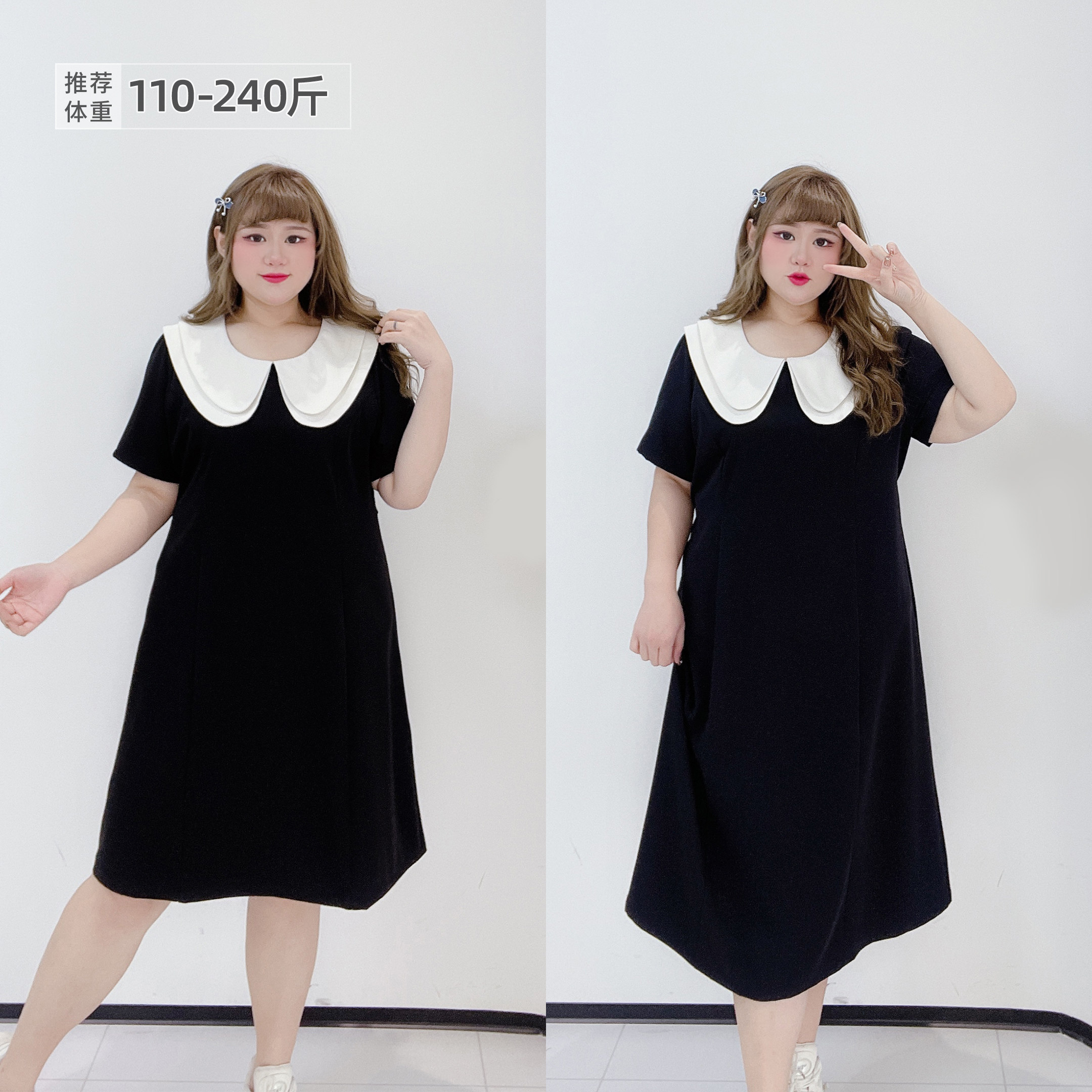 胖莹莹大码女装胖mm甜美撞色简约娃娃领A字长短款闺蜜显瘦连衣裙
