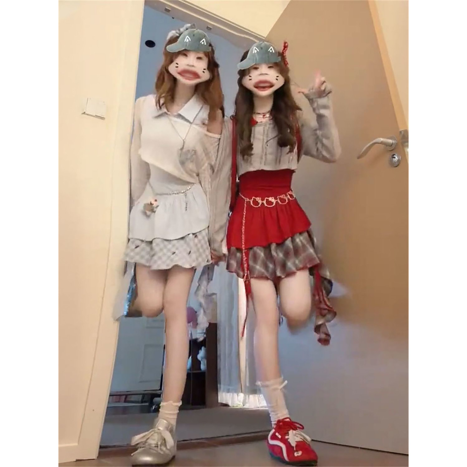 早春出游闺蜜时尚辣妹穿搭薄款防晒罩衫+格纹拼接连衣裙两件套装