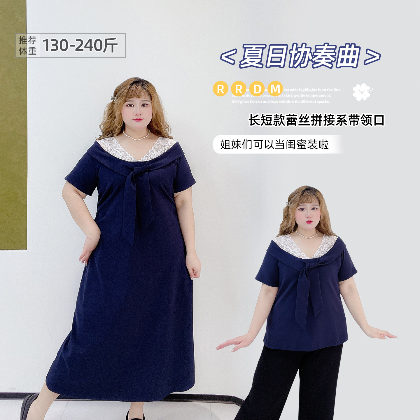 胖莹莹大码女装200斤胖mm蕾丝拼接系带收腰闺蜜装T恤弹力连衣裙