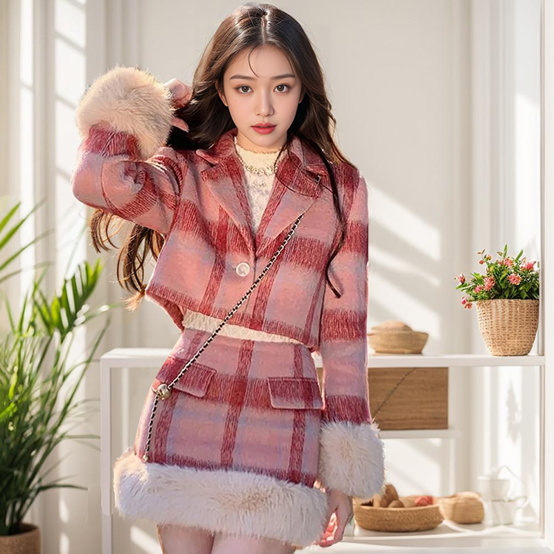 "焚木琴酒"格子小香毛呢外套半裙套装秋冬气质法式名媛撞色两件套