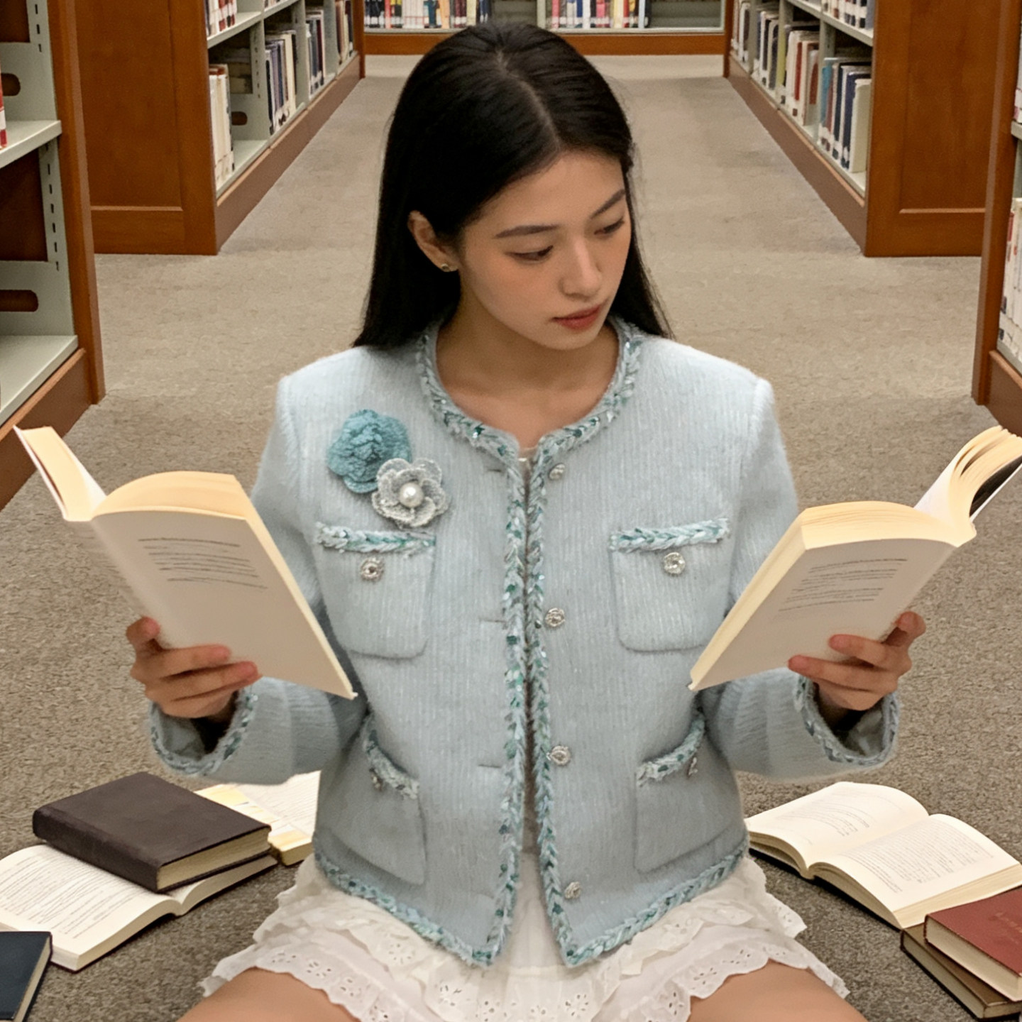 冬季高级感品质爆款新年蓝色亮片小香毛呢外套女短款加厚呢子大衣
