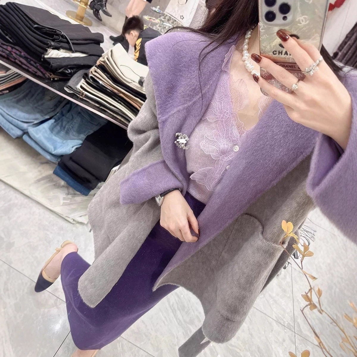 【气质名媛】紫色小香毛呢外套女新款宽松双面羊绒大衣系腰带秋冬