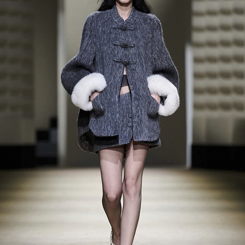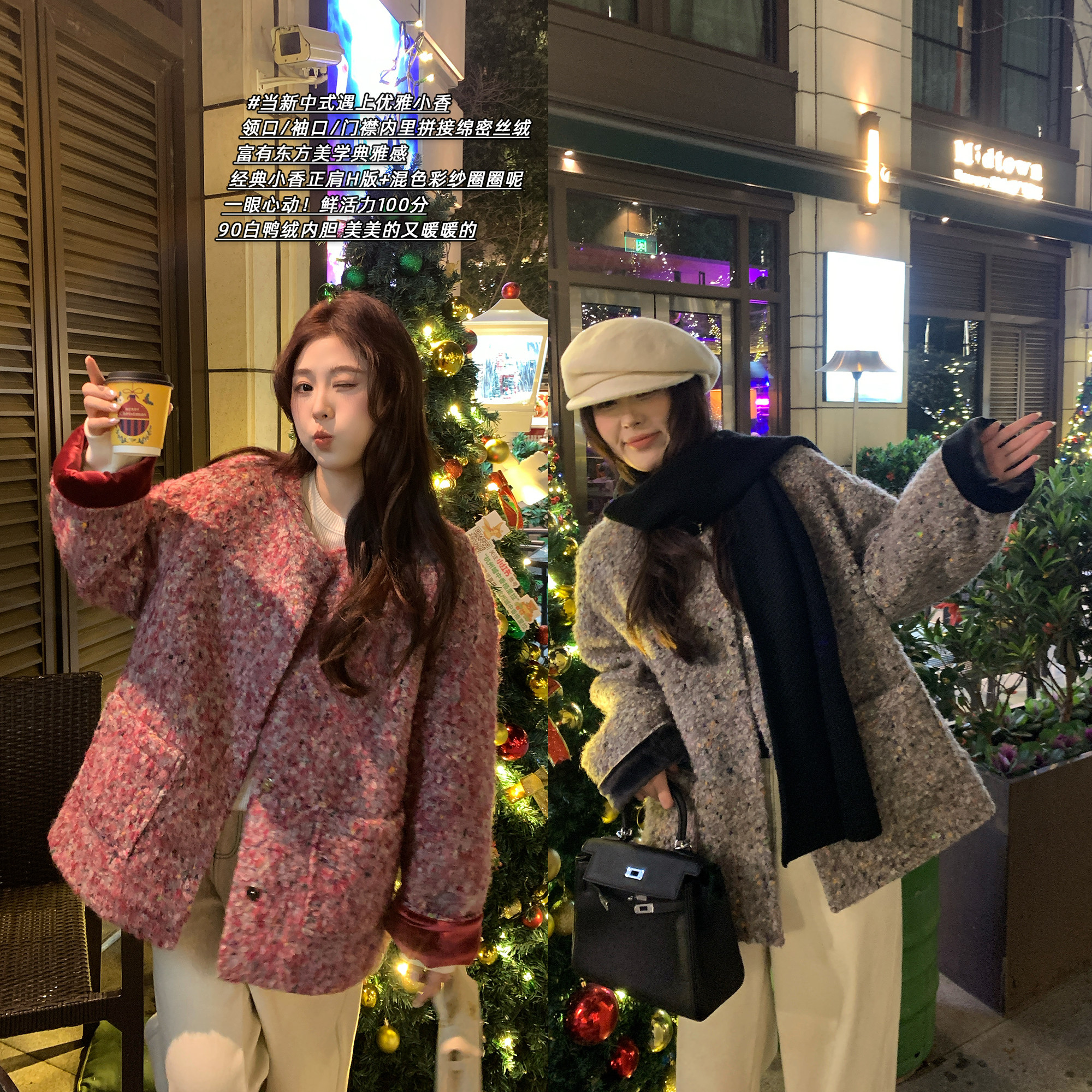 NAZ那子大码冬季羊毛设计感复古中式小香胖mm洋气羽绒毛呢外套女