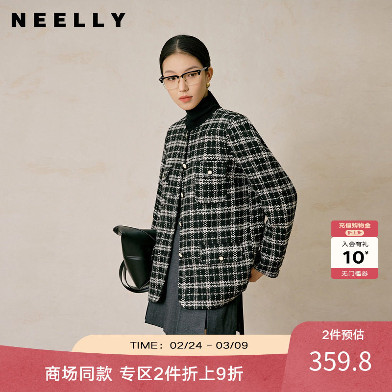 NEELLY纳俪商场同款冬季新款小香风格纹绵羊毛双面毛呢大衣外套女