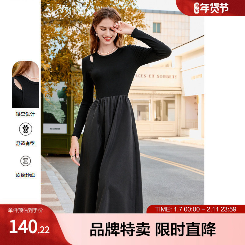 朗姿高腰a字假两件针织连衣裙设计感气质小黑裙2025年秋季新款女