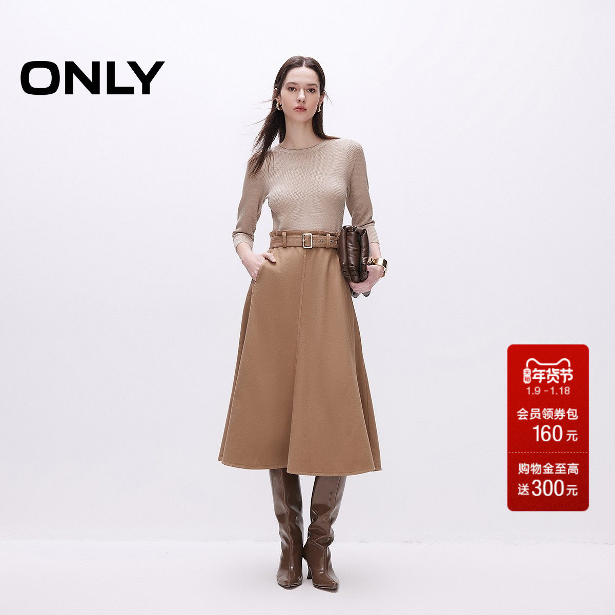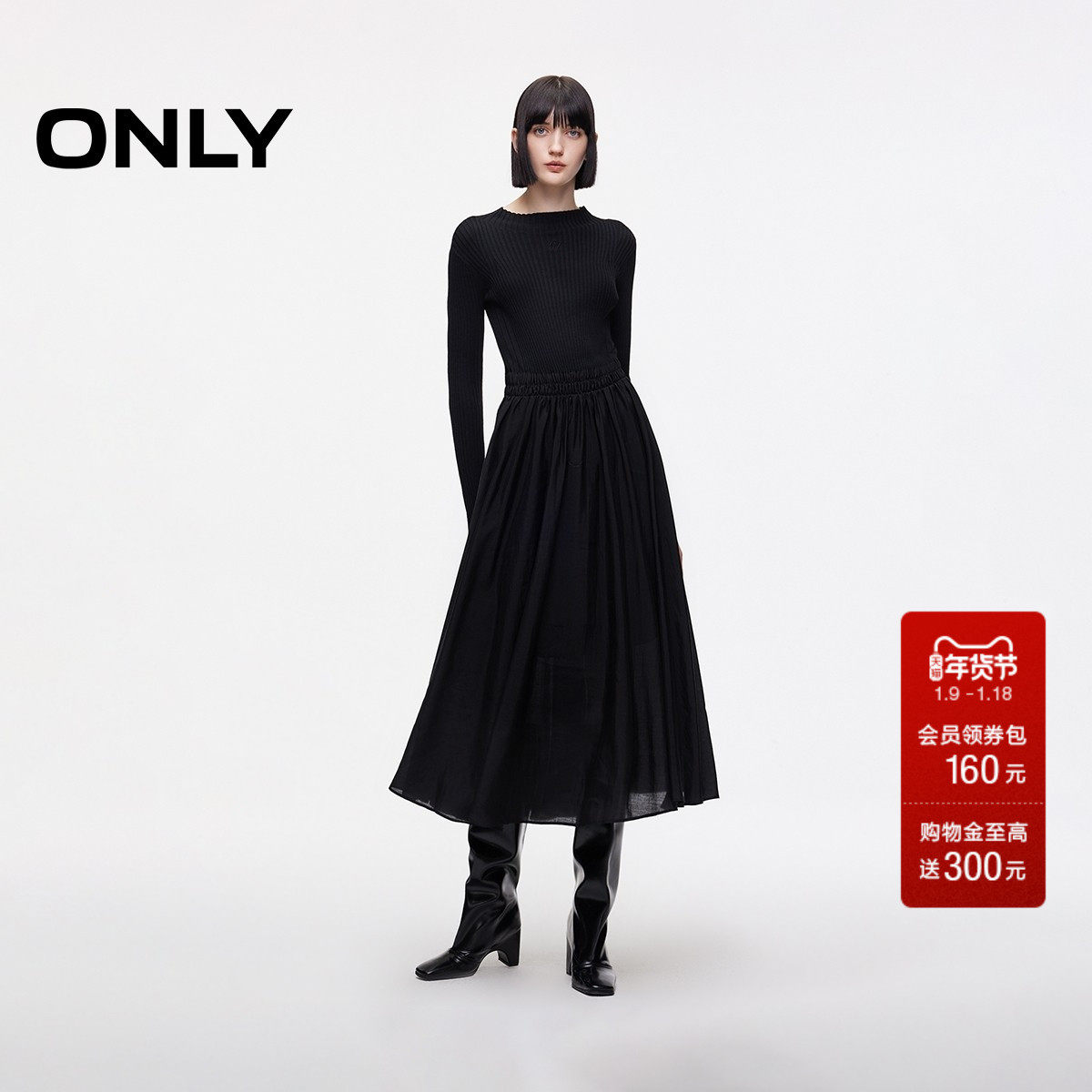 ONLY2025秋季新款腰部弹力抽褶高腰纯色显瘦针织拼接长裙连衣裙女