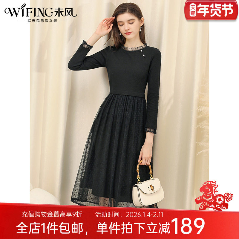 未风黑色针织网纱连衣裙女初秋2025年秋季新款假两件高腰显瘦裙子