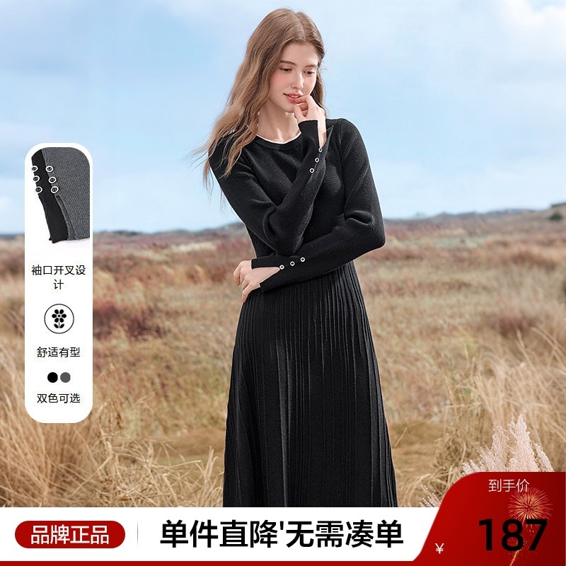 播黑色中长款修身打底针织连衣裙女冬高腰显瘦长裙DDR4LD5069
