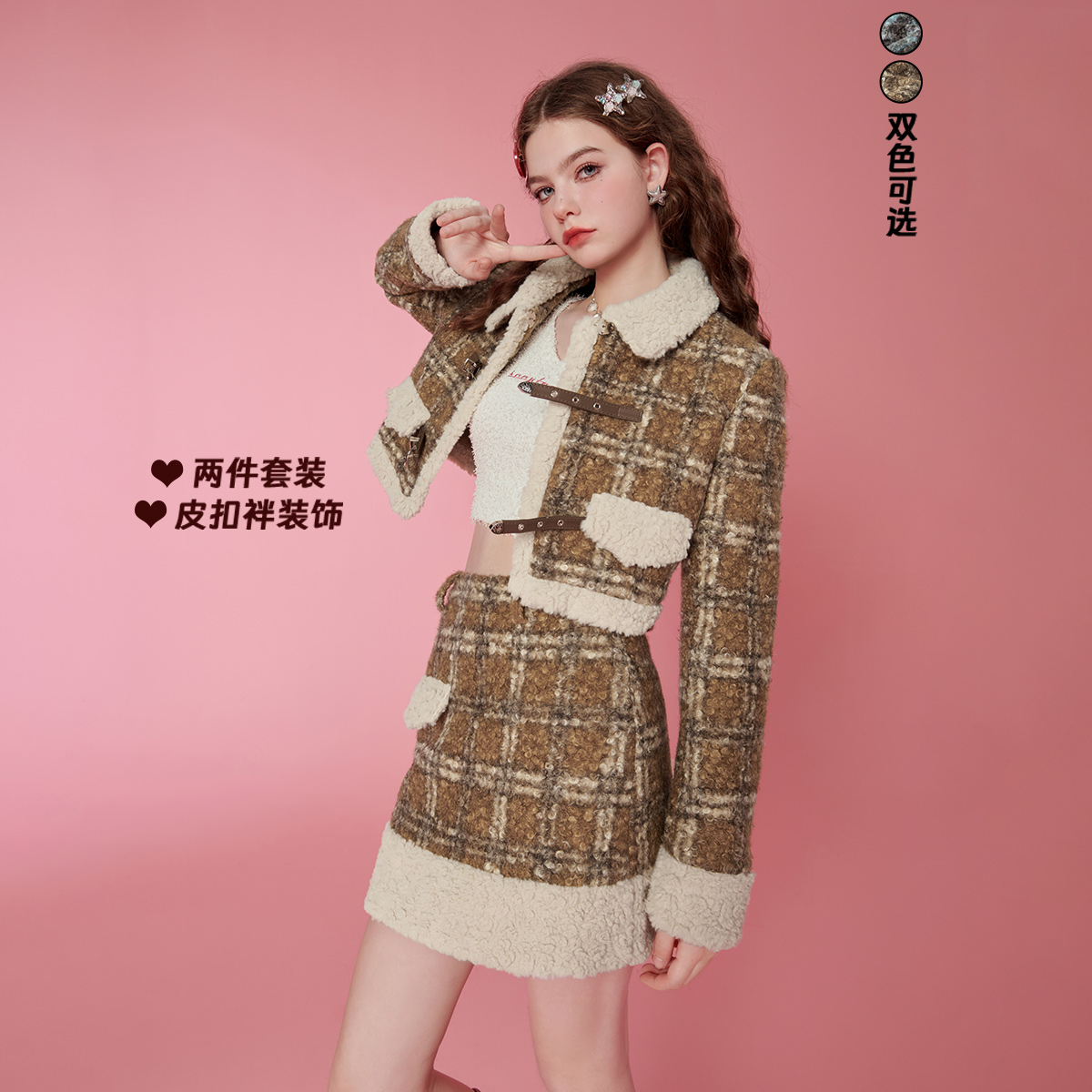 你的鱼 温莎古堡 韩系温柔微胖mm羊羔毛拼接短外套A字短裙套装