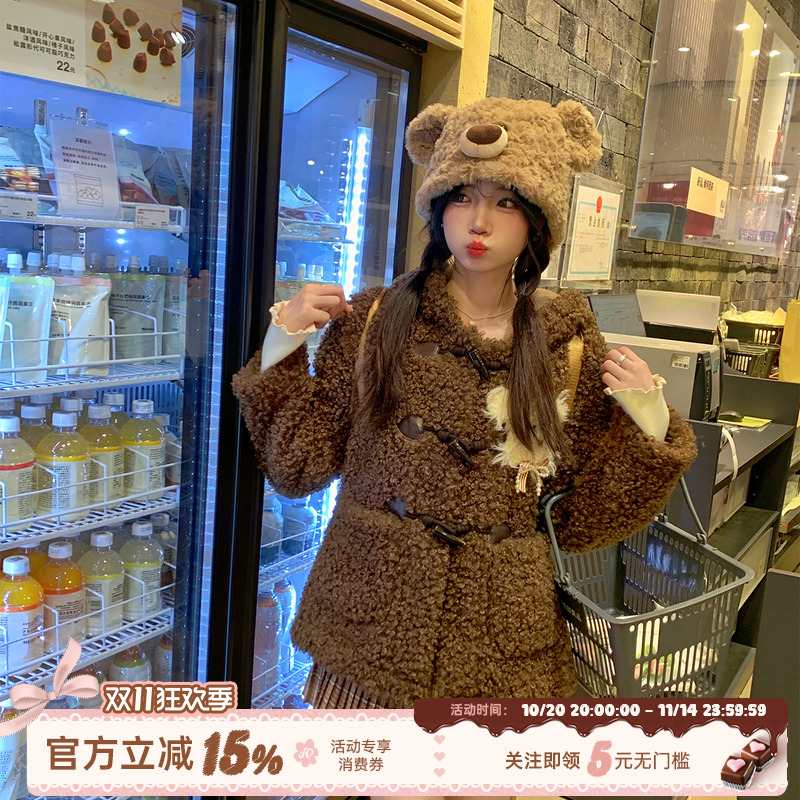 织物猪 榛果小熊 棕咖色慵懒风套装女小个子羊羔毛连帽外套百褶裙