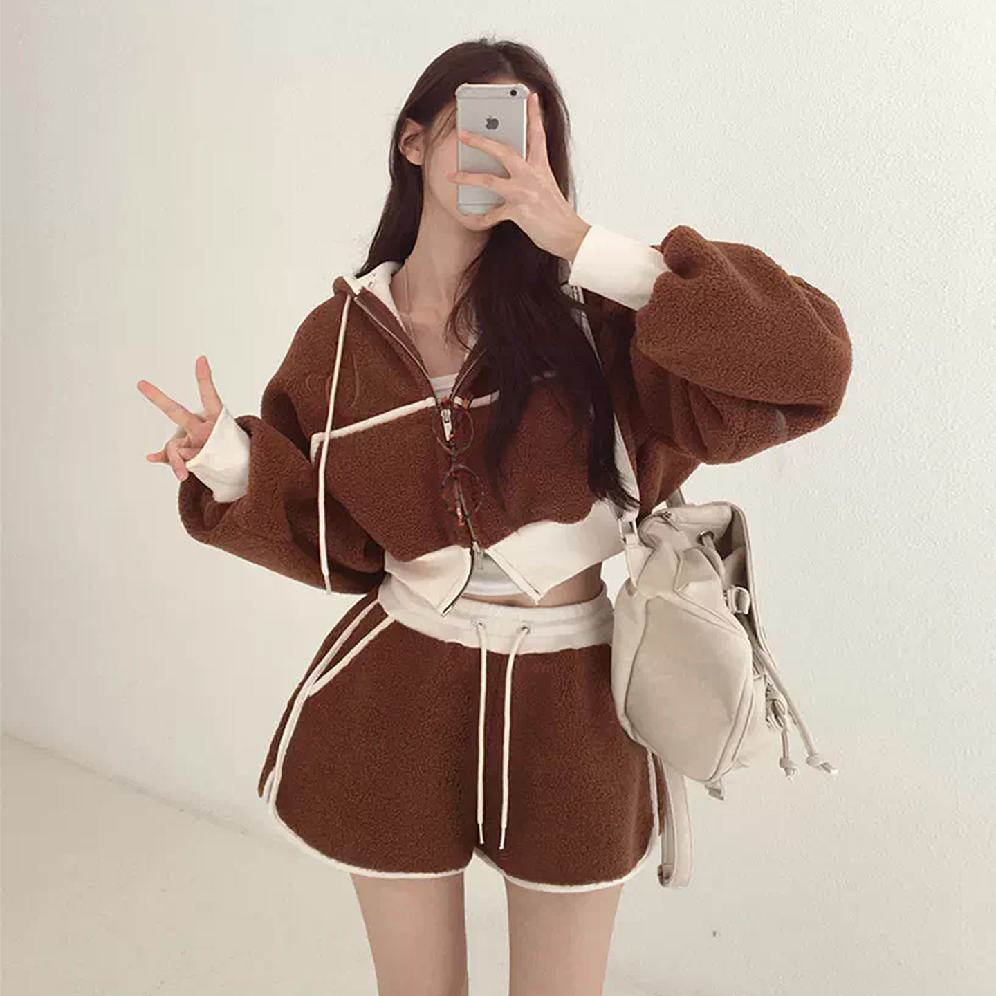 LXLILIUM 杏咖色小熊耳帽厚毛绒羊羔毛卫衣套装女秋冬短裤两件套