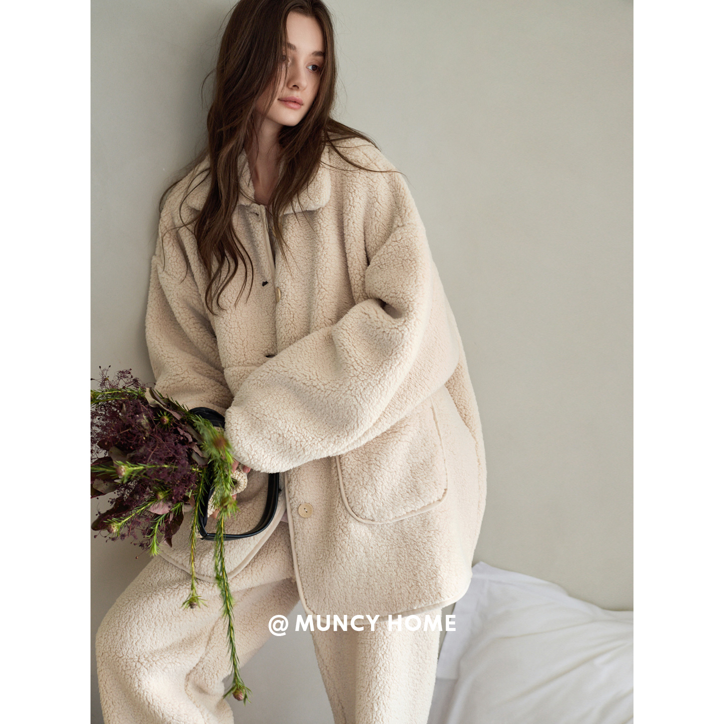曼系“慵懒圈圈”羊羔绒睡衣女秋冬季宽松保暖毛绒加厚家居服套装