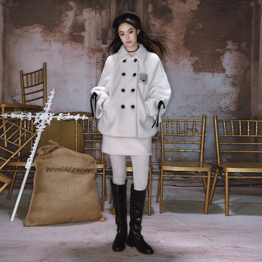 直播专享WANGREENCHENCLEAN白木晨 设计师白色羊羔毛斗篷套装WxC