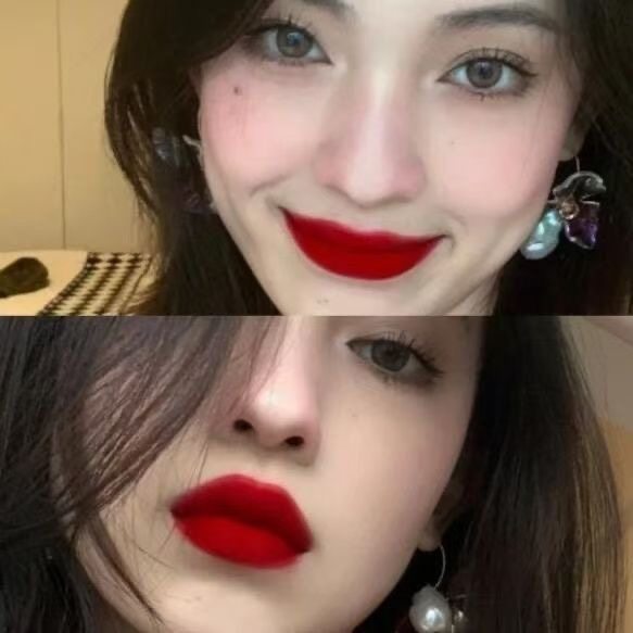 辣妹红唇妆!复古正红色唇釉唇泥显白口红不掉色不沾杯深砖大红色