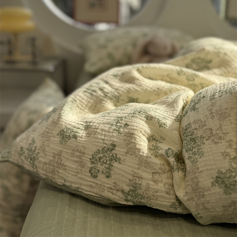 ins田园少女心皱皱纱清新绿色小碎花床上四件套全棉纯棉1.5m1.8米