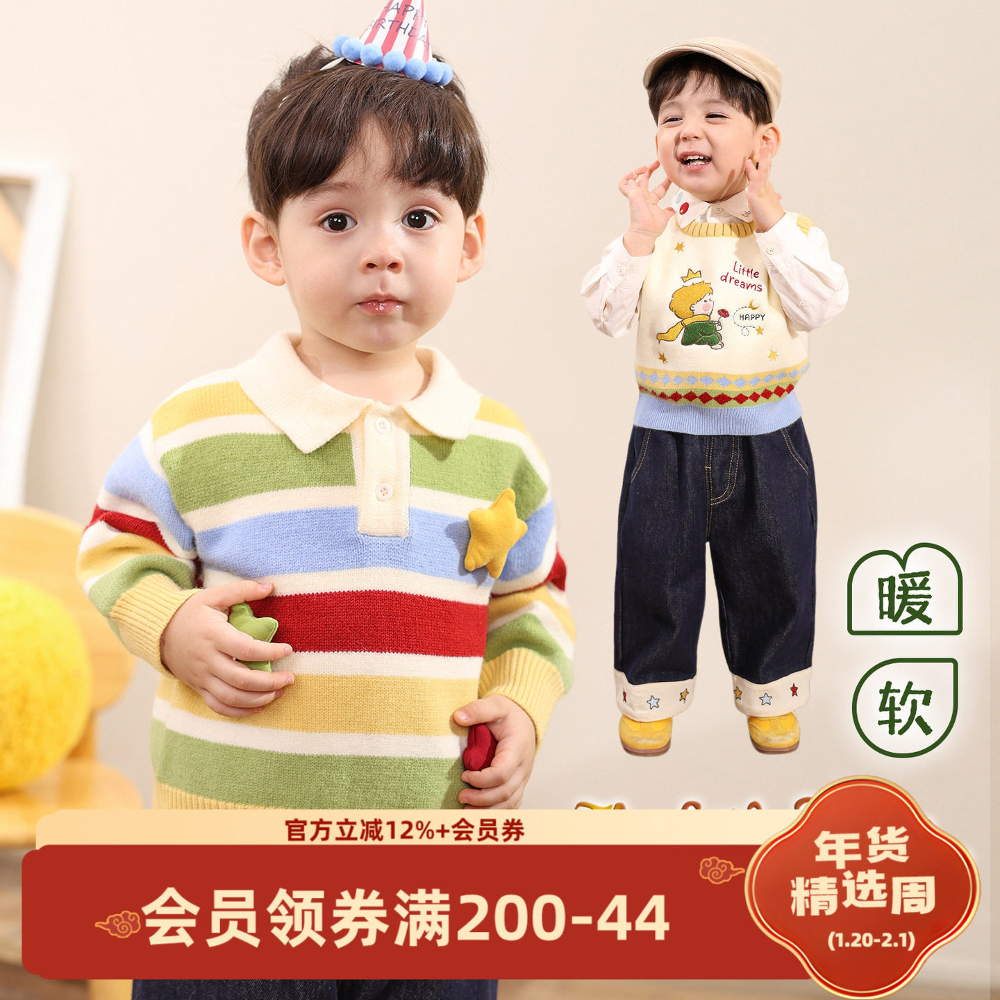 小O爸男婴童 宝宝冬装套装2025新款翻领毛衣马甲婴儿生日周岁服