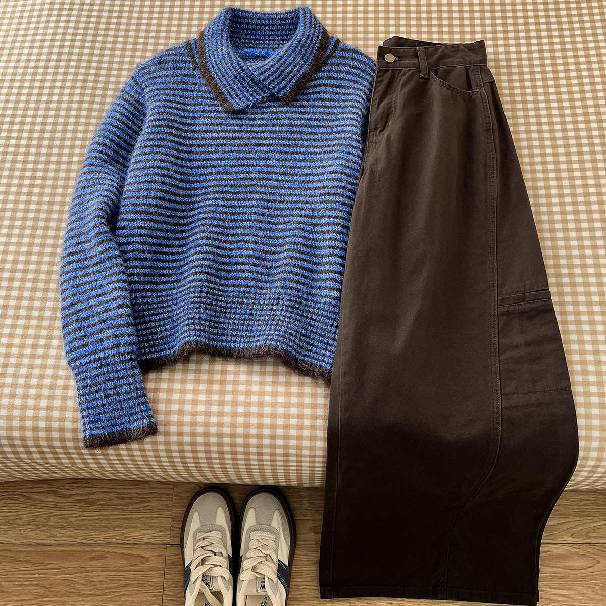 限定美学!港味chic翻领条纹毛衣上衣女高腰牛仔阔腿长裤冬装套装