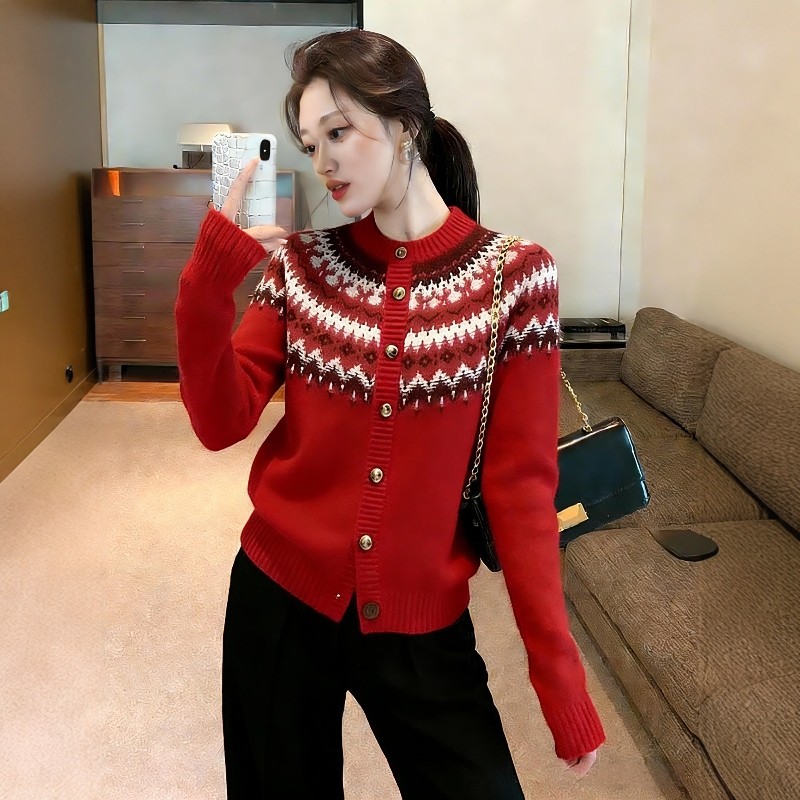 巨好看冬装套装韩系费尔岛圣诞慵懒风提花红色厚毛衣阔腿裤两件套