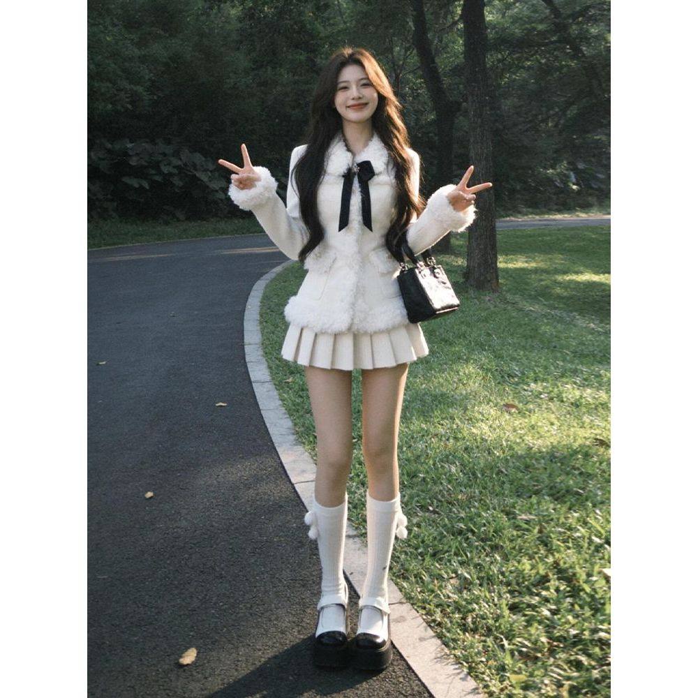 外贸撤回巨好看冬装套装韩系小香风米白色针织衫半身裙两件套女款