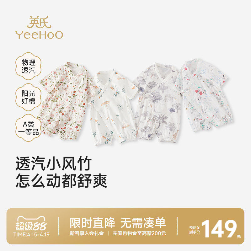 英氏婴儿衣服夏季透气纱布薄款短袖新生儿宝宝连体衣哈衣新款睡衣