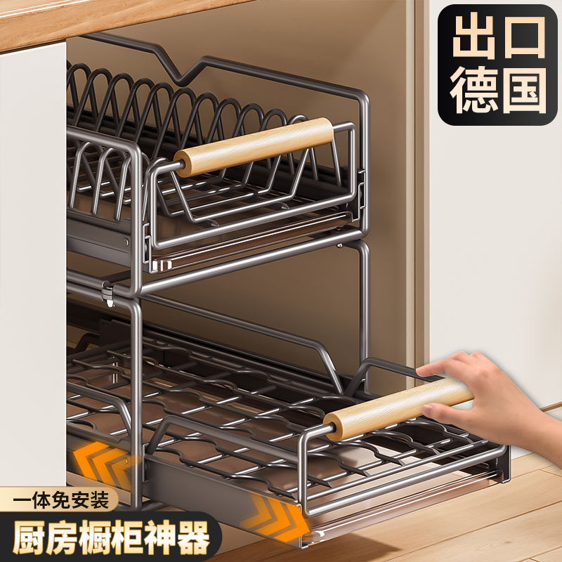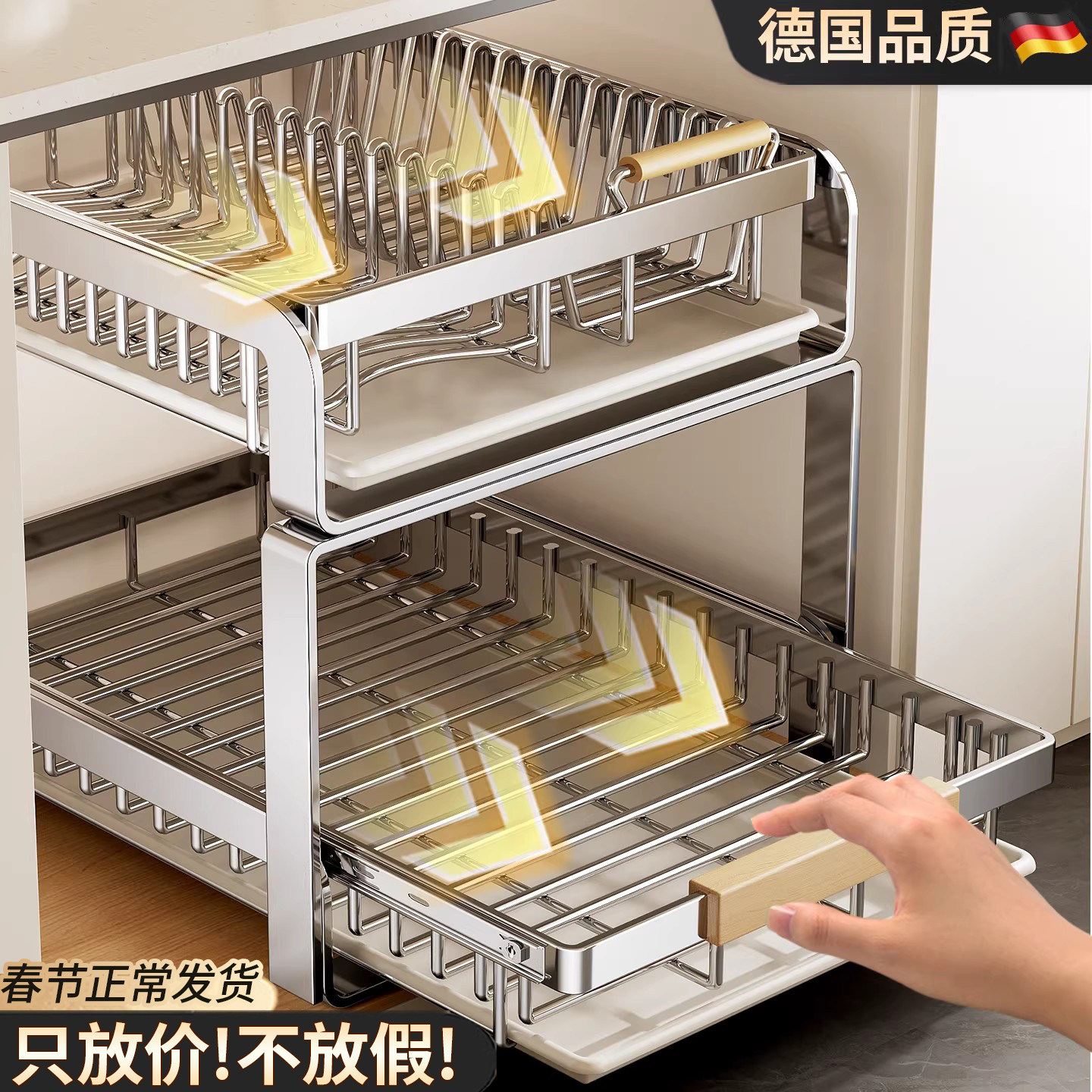 抽拉免打孔不锈钢碗碟置物架厨房橱柜内抽屉式拉篮碗盘沥水收纳架