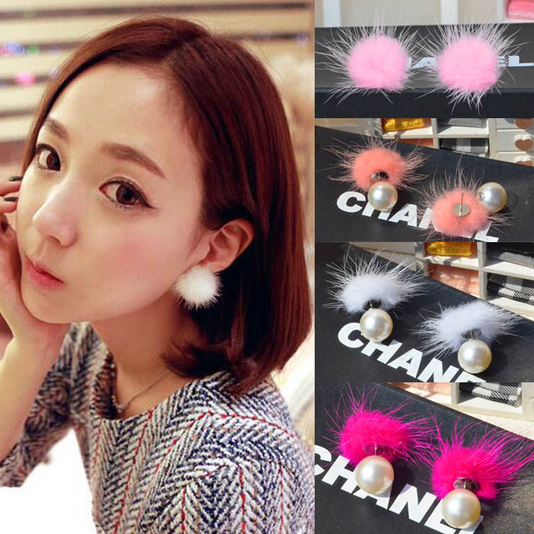 气质毛绒貂毛韩国珍珠毛毛耳钉女毛球兔毛毛毛球前后双头双面耳饰