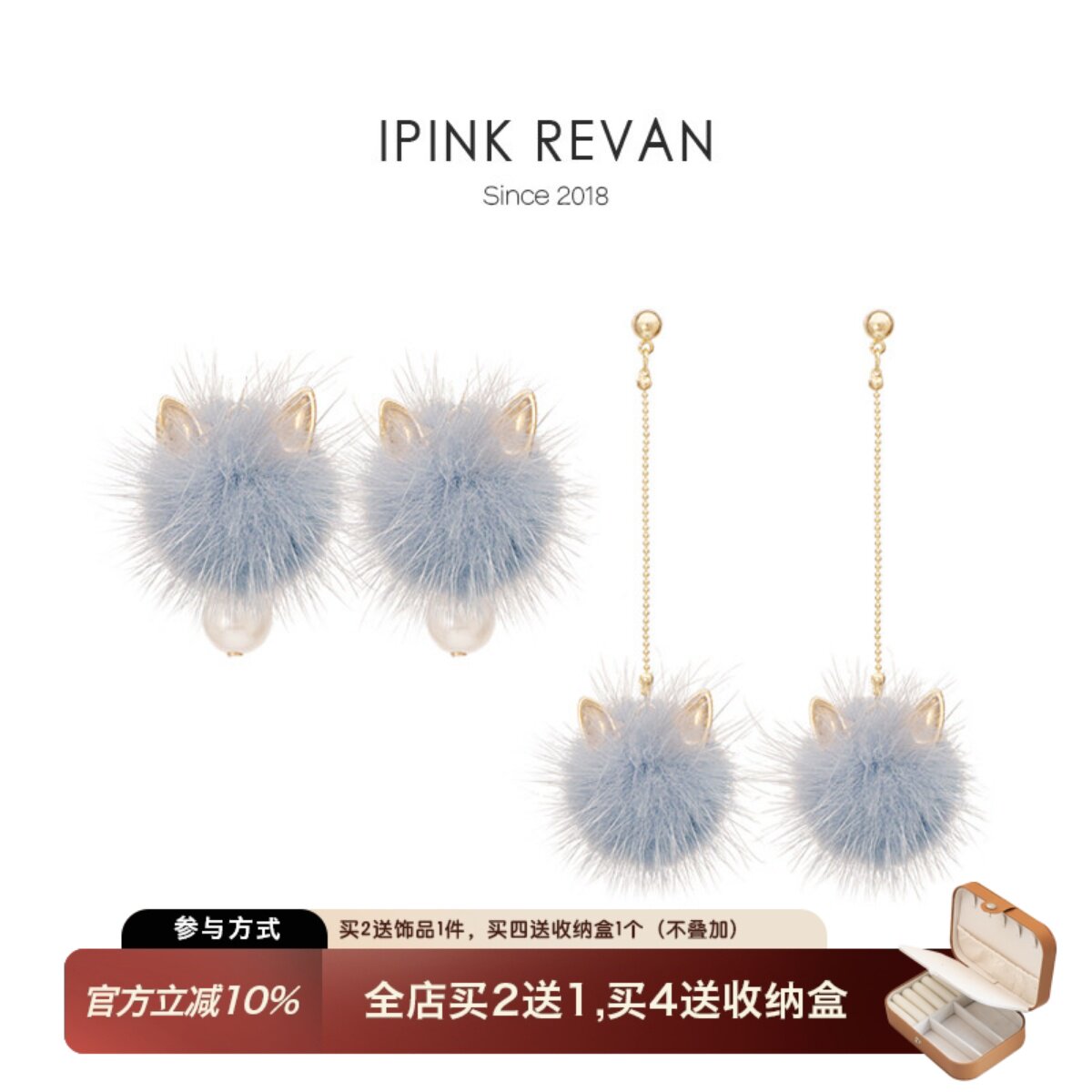 IPINK 猫咪水貂毛毛球耳针耳钉长款圆脸显脸瘦耳环耳夹女620
