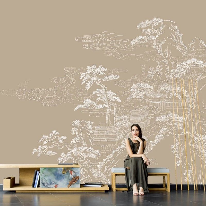 新中式古典山水画电视背景墙纸客厅沙发墙布酒店壁纸无缝卧室壁画