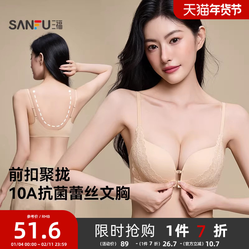 三福中薄杯无钢圈小胸聚拢文胸法式前扣蕾丝抗菌U背女士内衣胸罩