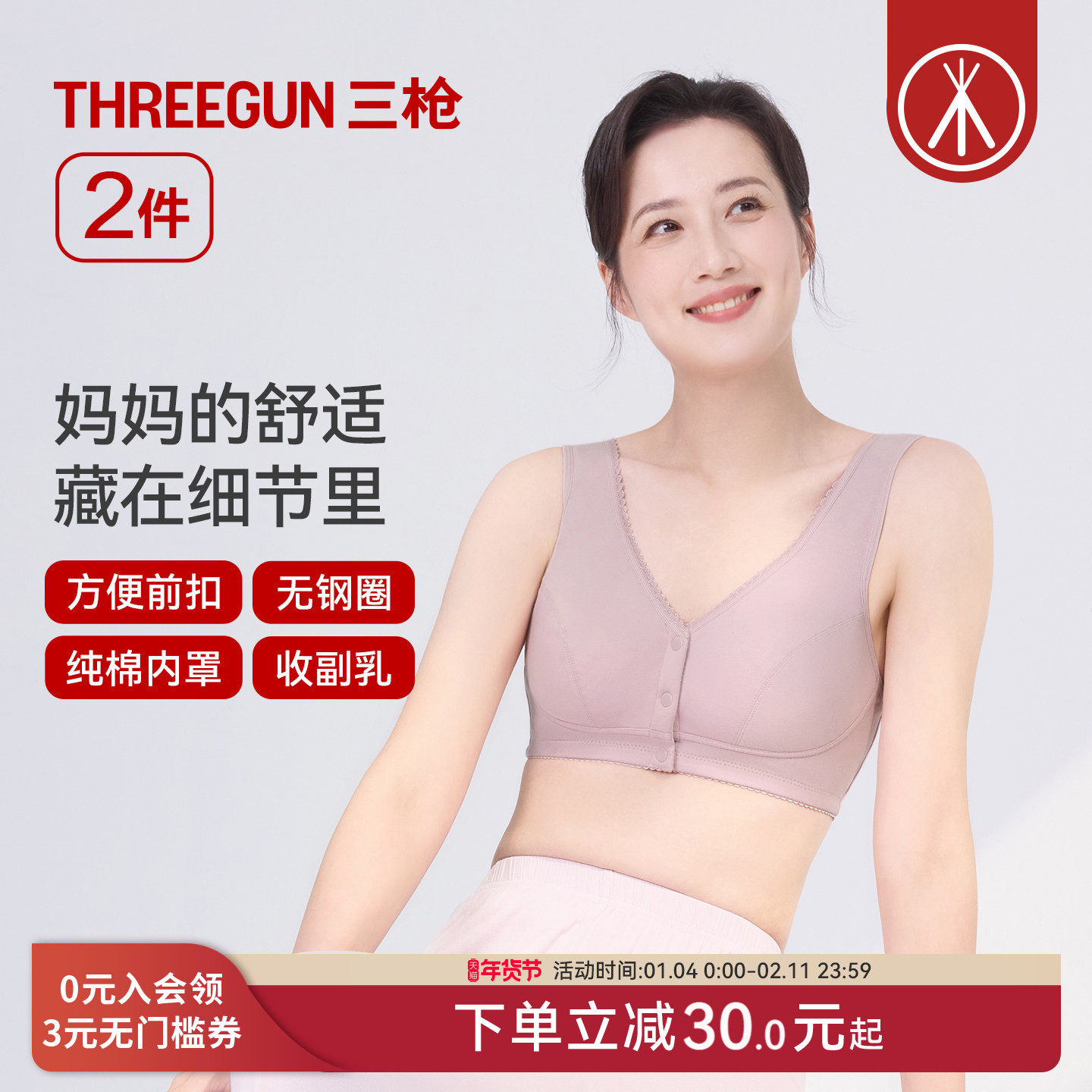 [2件]三枪前扣文胸无钢圈内衣秋冬薄款女背心中老年妈妈聚拢胸罩