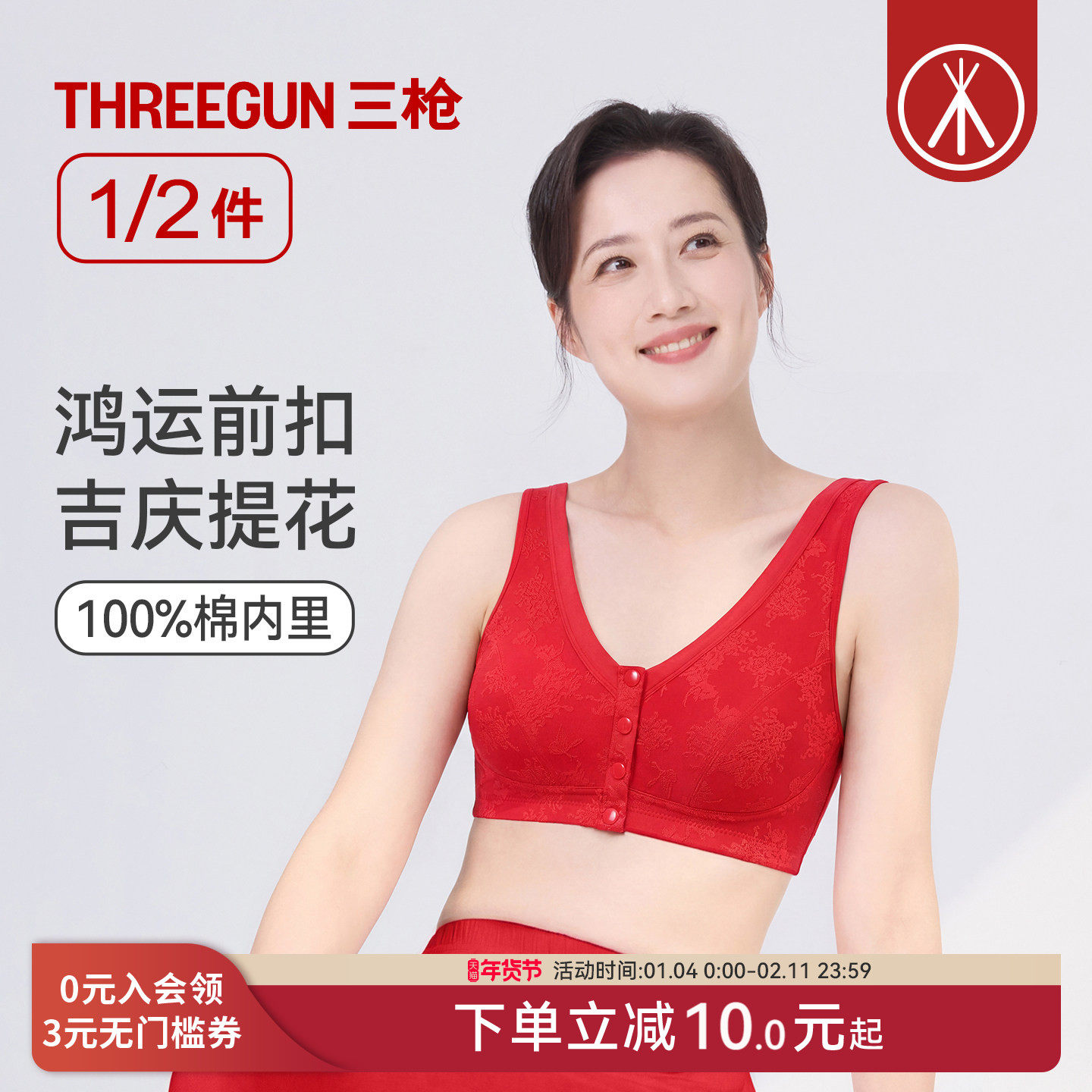 [1/2件]三枪前扣文胸无钢圈中老年蕾丝胸罩大红本命年马年女内衣