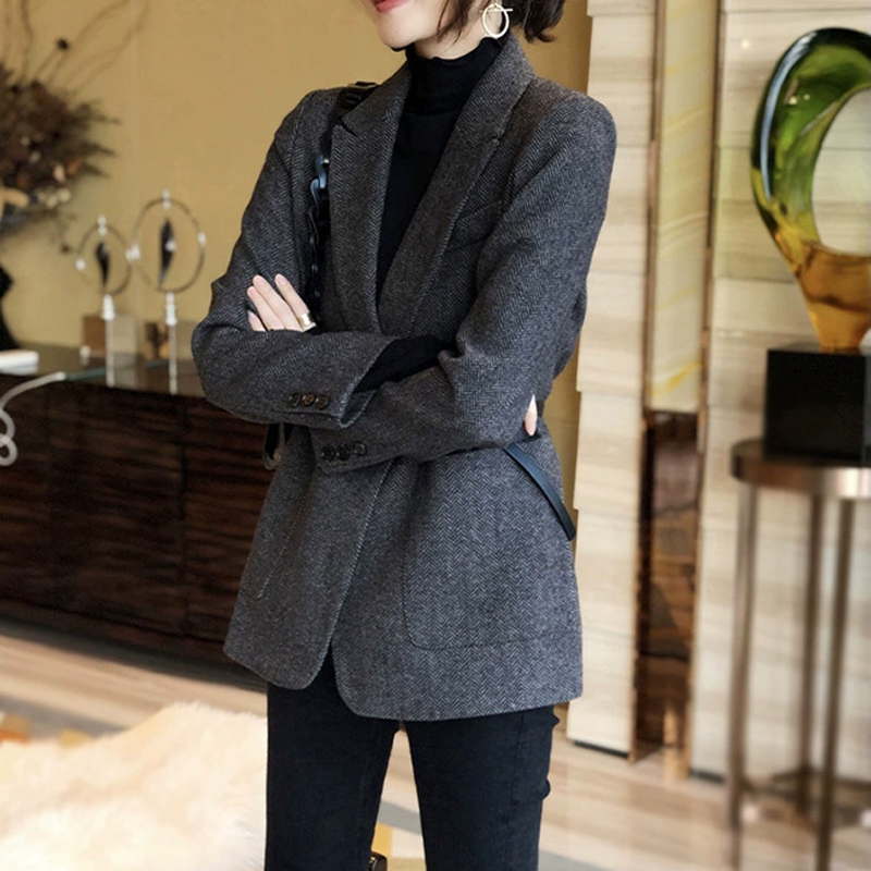 篙阶通勤!中长款羊毛人字纹小西服 春秋新款灰色毛呢小西装外套