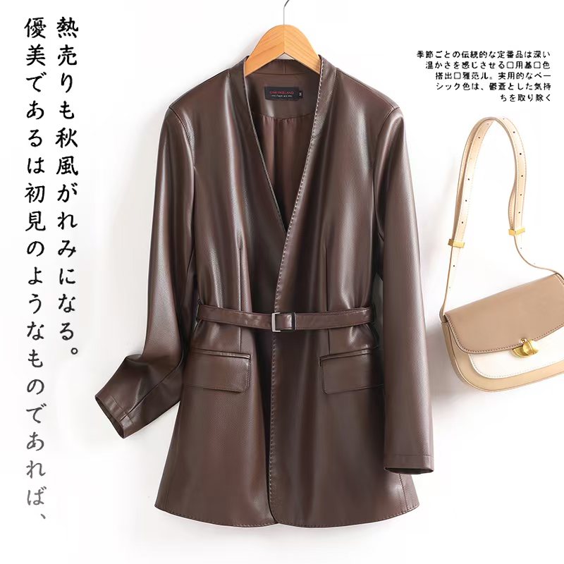 2025秋冬新款真皮皮衣女中长款小西服系带收腰风衣绵羊皮夹克外套