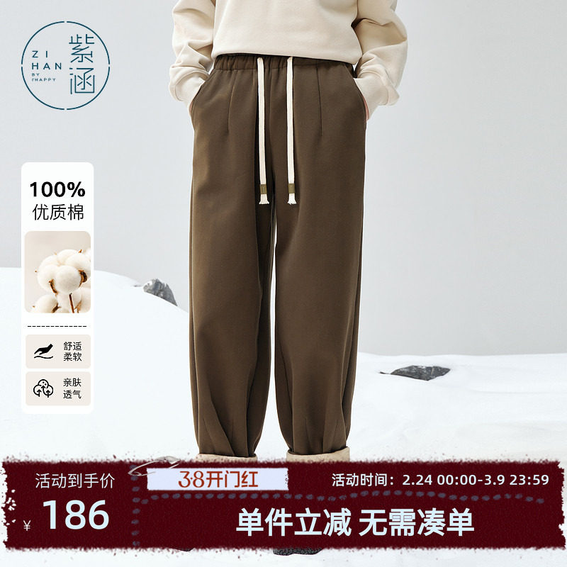 紫涵100%纯棉哈伦裤女冬季新款宽松显瘦高腰抽绳休闲裤子萝卜裤子