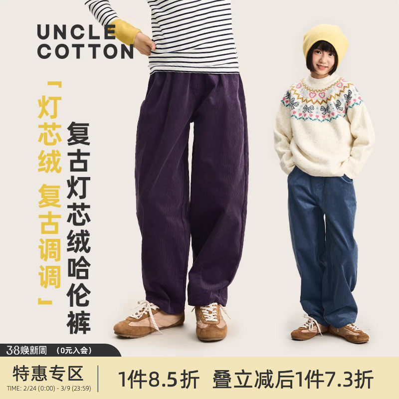 棉叔叔女童冬季新款复古保暖灯芯绒2025冬防风哈伦裤休闲舒适男童