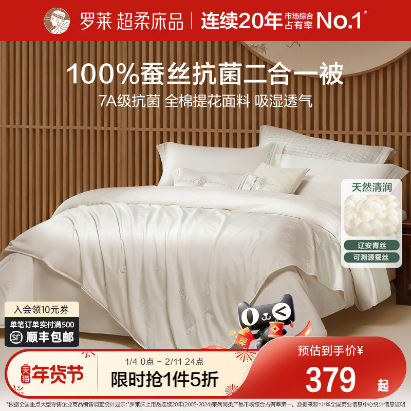 罗莱家纺全棉100蚕丝被子四季通用加厚冬被二合一被芯陪嫁喜被