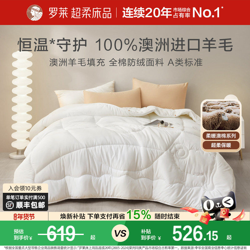 罗莱家纺100%全棉澳洲进口纯羊毛被春秋被子被芯抗菌加厚保暖冬被