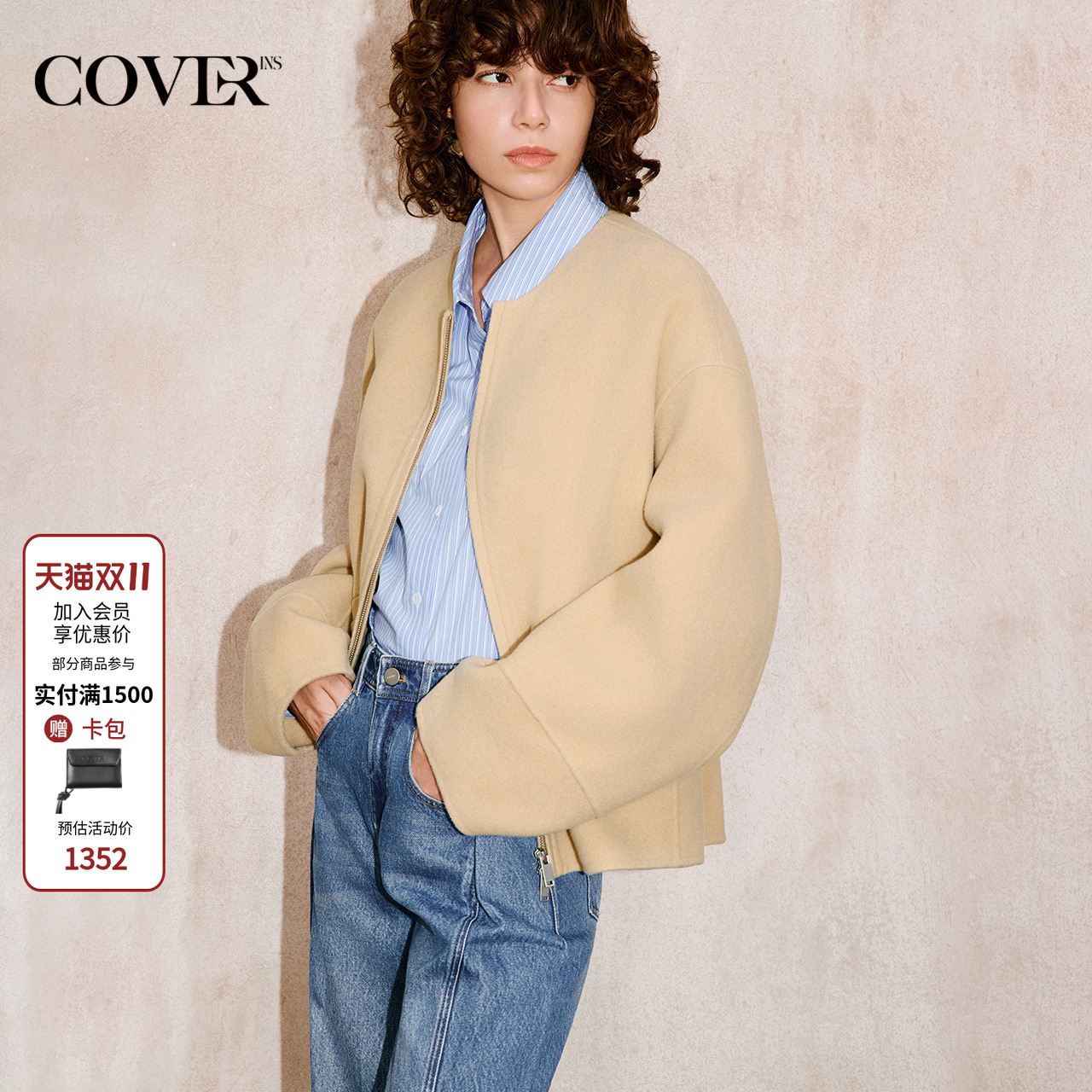COVERINS100羊毛廓形毛呢短外套女简约夹克2025冬新款CC35510010