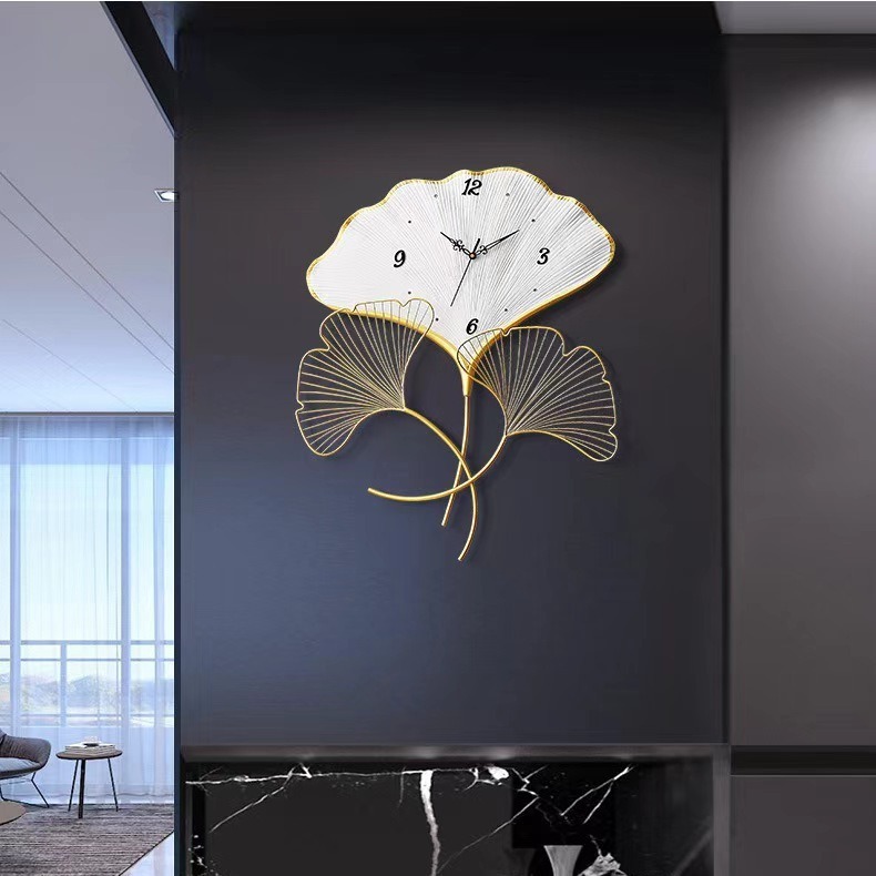 新中式银杏叶羽毛轻奢铁艺镂空挂钟时尚电视墙装饰静音异形时钟表