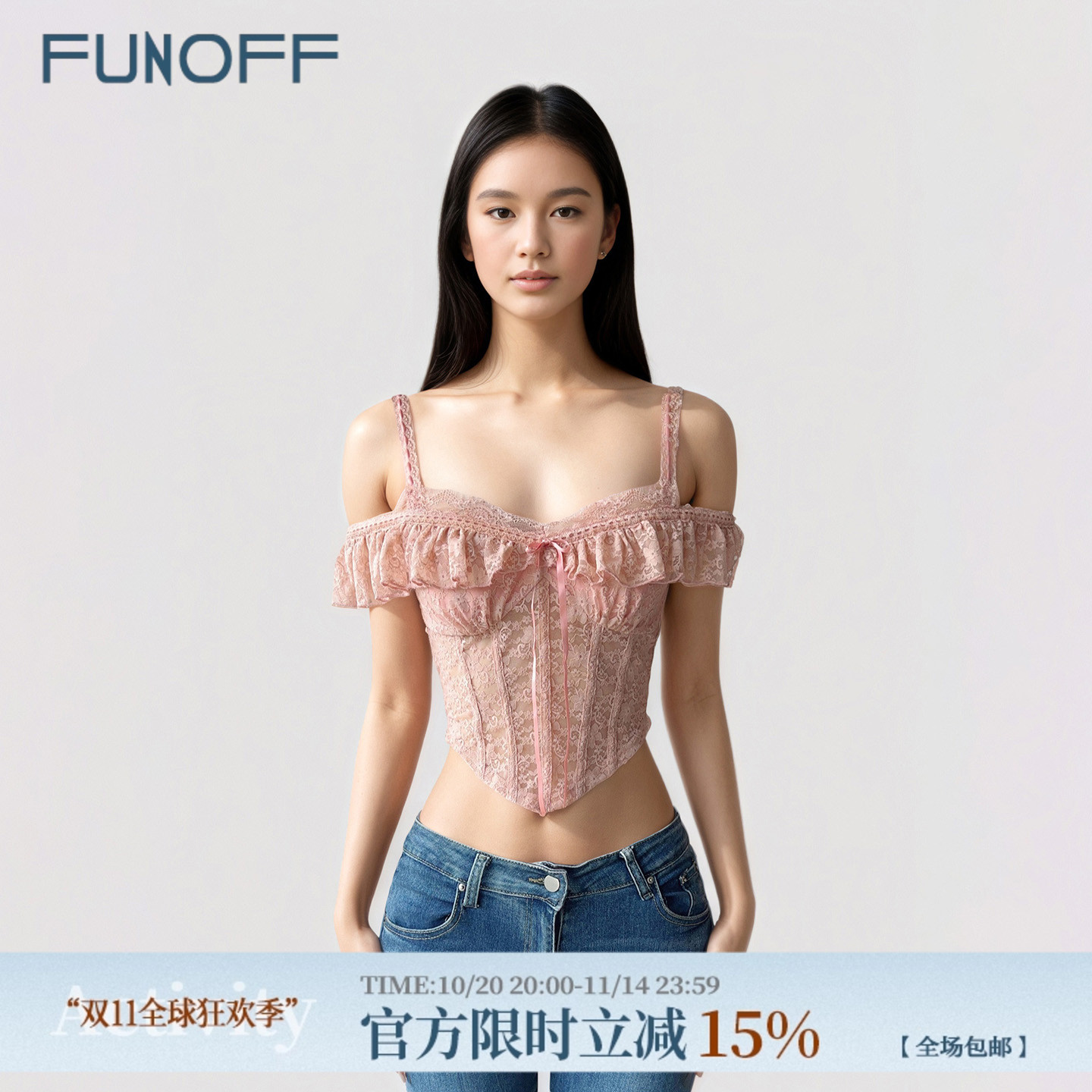 FUNOFF 法式粉色蕾丝荷叶边一字肩吊带复古绑带伪鱼骨露脐上衣夏