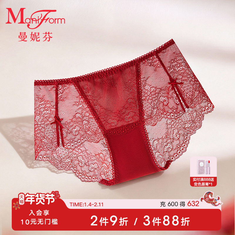 曼妮芬性感蕾丝本命年红色内裤女士三角裤中腰法式浪漫纯棉裆底裤