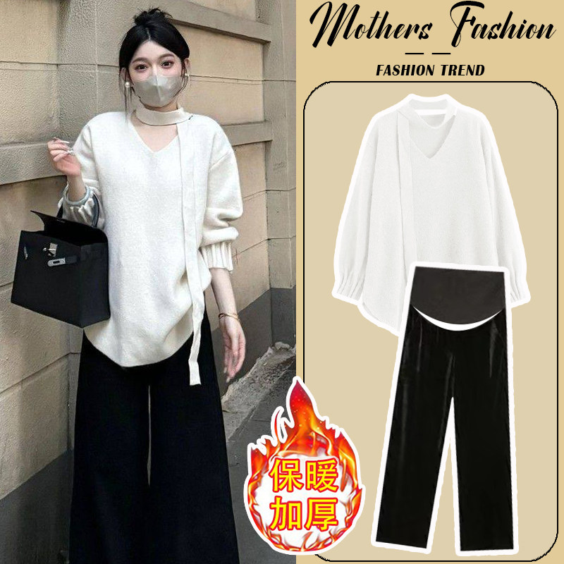 孕妇套装秋冬2026新款韩版遮肚灯笼袖V领加厚针织毛衣裤子两件套