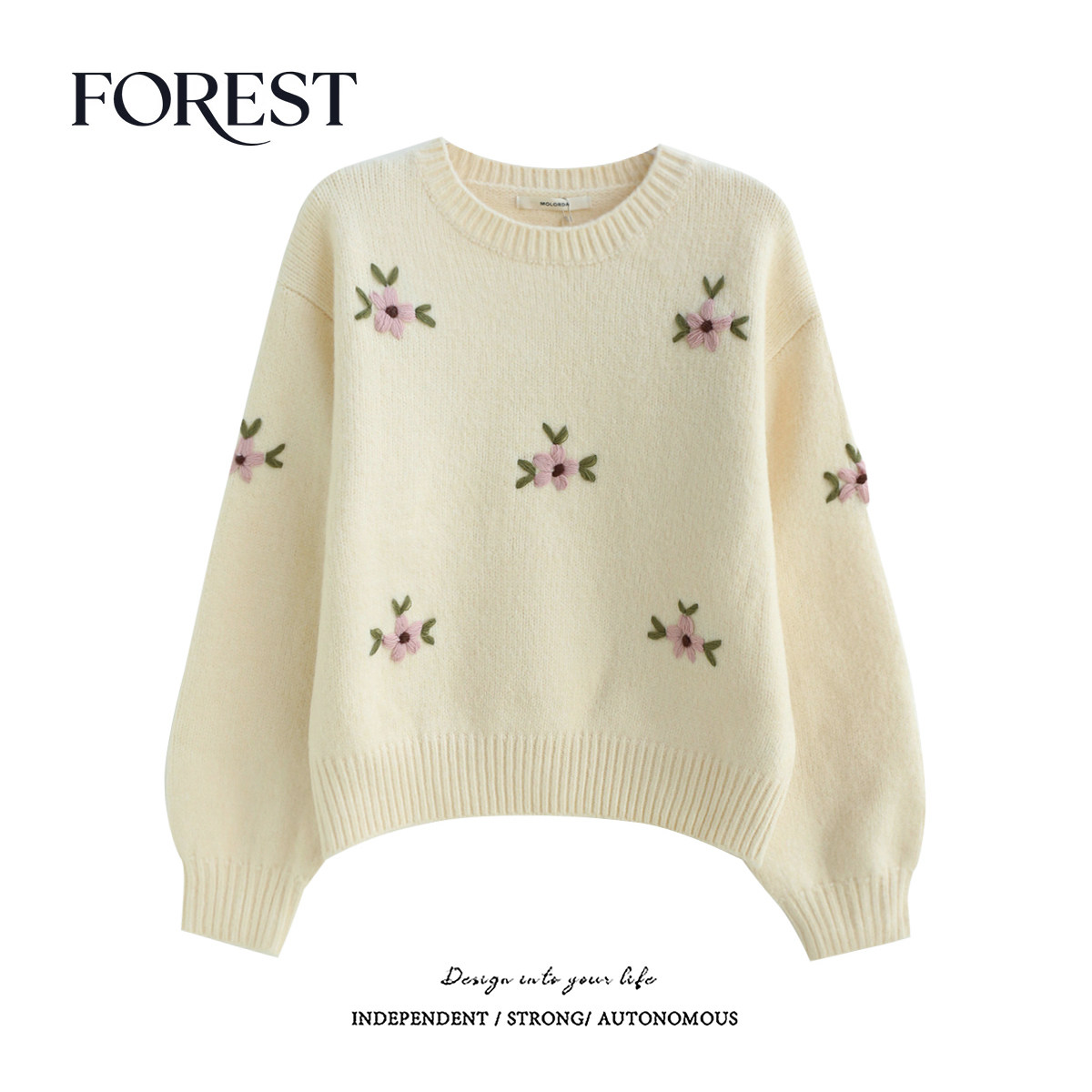 拾野森 冬装新款韩版宽松温柔慵懒风绣花灯笼袖圆领套头毛衣上衣